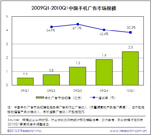 2010Q1中國手機廣告市場規(guī)模達到2.5億,環(huán)比增長30.3%.受季節(jié)性因素影響,手機廣告市場增速放緩,但是保持增長發(fā)展態(tài)勢。本季度,新聞、體育、數(shù)碼、女性和汽車類手機廣告市場表現(xiàn)良好,文本、橫幅、全屏以及客戶端軟件等手機廣告形式受到廣告主青睞。針對不同受眾群體進行多重定向廣告營銷成為更多手機廣告服務(wù)提供商的實踐方向。盡管本季度手機廣告市場取得良好的市場表現(xiàn)力,但是廣告定價和廣告效果評估等制約手機廣告市場發(fā)展的關(guān)鍵因素仍將長期存在。