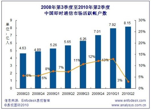 2010Q2中國(guó)即時(shí)通信市場(chǎng)活躍帳戶數(shù)超過(guò)8億