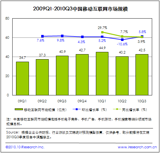 艾瑞:2010Q3中國移動互聯(lián)網(wǎng)市場規(guī)模小幅增長