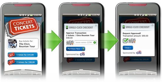 北京時(shí)間11月10日消息,據(jù)國外媒體報(bào)道,花旗銀行支持的Single-Click Checkout(singleclickcheckout.com)服務(wù)今天在舊金山的開放移動峰會(Open Mobile Summit)上推出,它是第一個為Android設(shè)計(jì)的信用卡結(jié)帳應(yīng)用程序。使用這項(xiàng)新服務(wù),商家可以接受來自任何移動用戶的信用卡付款。