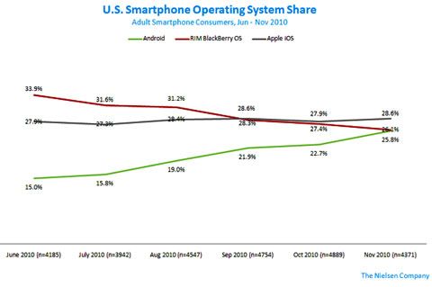 北京時間1月4日早間消息,市場研究公司尼爾森周一發(fā)布的報告顯示,在美國智能手機市場,蘋果的iOS的份額仍然排名首位,市場占有率為28.6%。