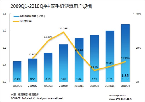 另外,從手機(jī)游戲用戶規(guī)模來看,2010年第4季度中國手機(jī)游戲用戶數(shù)量達(dá)到了1.35億,環(huán)比增長(zhǎng)11.9%。