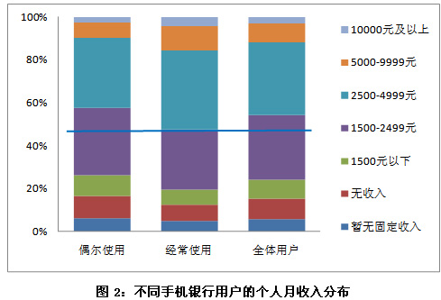 通過對不同手機(jī)銀行用戶的個人月收入分布可以看出,經(jīng)常使用手機(jī)銀行業(yè)務(wù)的用戶的個人月收入偏高,其中,個人月收入5000元以上的比例為15.4%,2500元以上的比例為52.2%,均高于偶爾使用手機(jī)銀行業(yè)務(wù)的用戶。事實上,經(jīng)常使用手機(jī)銀行業(yè)務(wù)的用戶由于收入偏高且手機(jī)銀行使用頻率高,必然成為手機(jī)銀行業(yè)務(wù)的核心客戶,這一較為富裕的目標(biāo)群體將在很大程度上促進(jìn)手機(jī)銀行業(yè)務(wù)的繁榮。