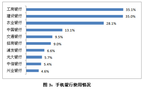在對手機(jī)銀行用戶對手機(jī)銀行使用的情況分析來看,工商銀行(601398,股吧)手機(jī)銀行的使用率依然最高,達(dá)35.1%,建設(shè)銀行(601939,股吧)緊隨其后,為35.0%。通過進(jìn)一步的分析發(fā)現(xiàn),在經(jīng)常使用手機(jī)銀行的用戶中,對建設(shè)銀行手機(jī)銀行的使用率(37.4%)略高于對工商銀行的使用率(36.0%),這表明建設(shè)銀行的用戶相對養(yǎng)成了使用手機(jī)銀行的習(xí)慣。另外,農(nóng)業(yè)銀行(601288,股吧與中國銀行的使用率在這半年中都有顯著提升,不斷縮小與行業(yè)領(lǐng)跑者的差距。