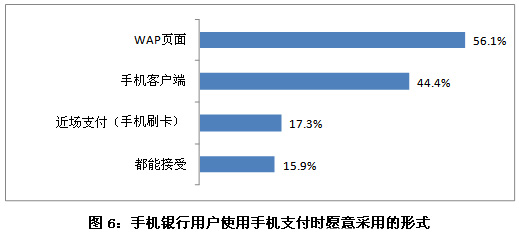 另外,手機(jī)銀行用戶使用手機(jī)支付時,首選的是WAP頁面,56.1%的用戶更愿意采用這種形式。其次是手機(jī)客戶端,其比例為44.4%。近場支付(手機(jī)刷卡)這樣支付形式較為新穎,愿意使用的用戶比例僅占17.3%。此外,有15.9%的人以上三種方式都能接受。