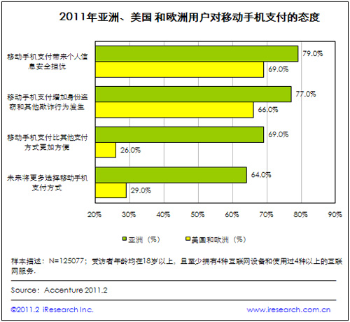 iResearch艾瑞咨詢根據(jù)Accenture的研究調(diào)查數(shù)據(jù)發(fā)現(xiàn),移動手機支付安全問題受到全球用戶的普遍關(guān)心。根據(jù)2011年Accenture對亞洲、美國以及歐洲125077位手機用戶進行的網(wǎng)上調(diào)查顯示,亞洲79%的受訪者擔心移動手機支付帶來的個人信息安全隱患,77%的受訪者擔心身份盜竊和其他欺詐行為的發(fā)生;美國和歐洲擔心以上安全問題的用戶也分別占到69%和66%。