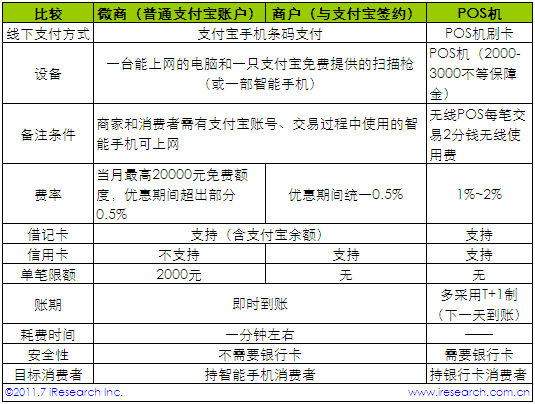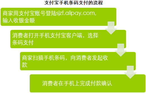 2011年7月1日上午,支付寶在2011廣州網貨會上推出手機支付產品——條碼支付(Barcode Pay)。在支付過程中使用這種產品,消費者與商家之間只有掃描條碼的接觸,不需要出示任何銀行卡。該支付方式主要針對現實中的微小商戶(如小賣店、便利店),為其提供低成本收款服務。
