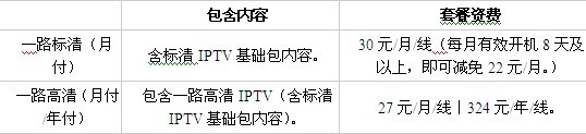 在IPTV的推廣上,江蘇電信也采取了和現(xiàn)有E家套餐捆綁的方式進(jìn)行推廣,F(xiàn)已推出高清IPTV服務(wù)。具體費(fèi)用見(jiàn)下表: