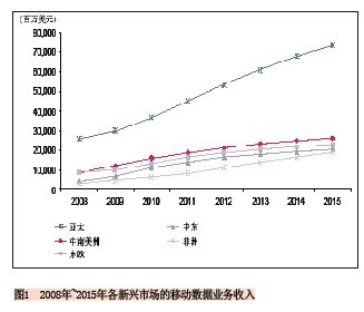 我們預測,2015年新興市場運營商的移動數(shù)據(jù)業(yè)務收入將達到1620億美元,在2010年這一數(shù)字只有834億美元,5年間的復合年均增長率將達到14%,總體增長率為94%。顯而易見的是,移動數(shù)據(jù)業(yè)務將快速發(fā)展,未來將成為運營商制勝新興市場的關(guān)鍵。