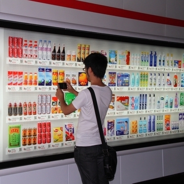 這種虛擬商店消費模式如今正漂洋過海而來,北京移動此前就曾推出過麥當勞電子兌換單服務,用戶可以通過短信接收二維碼,再去麥當勞門店掃描兌現(xiàn)。而細心的申城用戶如今也能在軌交過道中發(fā)現(xiàn)這樣的虛擬百貨商店廣告,這些燈箱廣告中出現(xiàn)了超市中才能見到的商品貨架,五顏六色的商品圖案讓人仿佛置身于大型超市一樣,但只有當你走近才會發(fā)現(xiàn)“貨架”竟然是“貼”在墻上的,從零食到衣服,甚至還有尿片,這里每一種產(chǎn)品下方都有相應價格和二維碼。