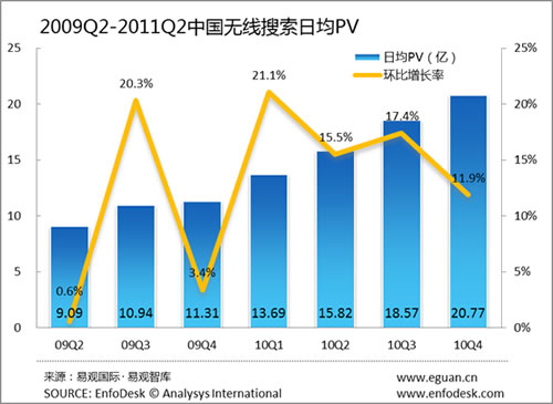 從無線搜索市場的PV來看,2011年第2季度中國無線搜索市場日均PV已經(jīng)突破24億次,環(huán)比上季度增長為11.0%,增長率相比上個(gè)季度開始反彈。