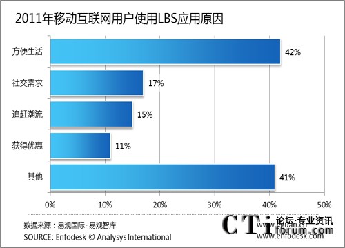 CTI論壇(ctiforum)8月26日消息(記者 張潔):根據(jù)易觀國際(Analysys international)最新調研顯示,42%的使用LBS用戶認為使用應用程序可以方便生活,17%的用戶認為是社交需求,15%的用戶只是出于追趕潮流的目的,11%的用戶認為使用LBS應用程序可以獲得一定的優(yōu)惠。