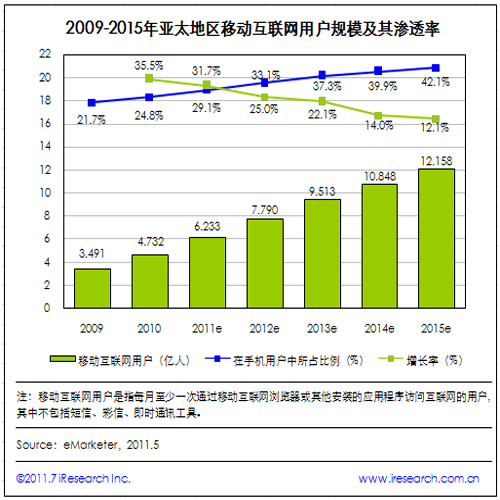 iResearch艾瑞咨詢整理eMarketer數(shù)據(jù)時發(fā)現(xiàn),2010年亞太地區(qū)移動互聯(lián)網(wǎng)用戶規(guī)模達(dá)到4.732億,較2009年增長35.5%,占手機用戶總數(shù)的24.8%。預(yù)計2011年移動互聯(lián)網(wǎng)用戶數(shù)將達(dá)6.233億,增幅為31.7%,占手機用戶總數(shù)的29.1%。在未來的5年里,亞太地區(qū)移動互聯(lián)網(wǎng)用戶規(guī)模增速有所下降,但其在手機用戶總數(shù)中的比例將進(jìn)一步增加。