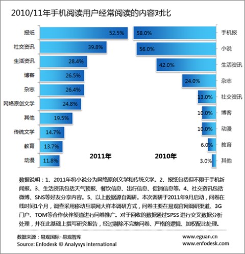 易觀國際(Analysys International)分析認為之所以微博、SNS等社交資訊在手機閱讀用戶經(jīng)常閱讀的內(nèi)容分類中超過小說主要有以下兩個原因: