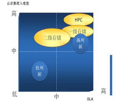 從企業(yè)戰(zhàn)略咨詢分析師的角度,我認(rèn)為IBM的戰(zhàn)略布局和資源整合策略確實(shí)是IT領(lǐng)域戰(zhàn)略規(guī)劃很好的教科書(起碼對(duì)于我個(gè)人而言)。精準(zhǔn)的定位市場(chǎng)、以具有明顯技術(shù)細(xì)分優(yōu)勢(shì)的產(chǎn)品或服務(wù)切入市場(chǎng)、設(shè)定較高的技術(shù)準(zhǔn)入門檻,這些戰(zhàn)略舉措不僅有助于IBM快速占領(lǐng)新生市場(chǎng)戰(zhàn)略制高點(diǎn),同時(shí)保證了其可持續(xù)競(jìng)爭(zhēng)優(yōu)勢(shì)和利潤(rùn)空間。從下面的云計(jì)算準(zhǔn)入/云服務(wù)SLA象限圖上,當(dāng)很多廠商還在考慮“哪塊云彩有雨”時(shí),IBM已經(jīng)完成在云端提供HPC和高增值二級(jí)存儲(chǔ)服務(wù)的布局,掌控了利潤(rùn)最豐厚的云計(jì)算高端市場(chǎng)。從我個(gè)人的預(yù)測(cè),IBM在云端提供一級(jí)存儲(chǔ)服務(wù),應(yīng)該是其云計(jì)算高端戰(zhàn)略的下一個(gè)布局。