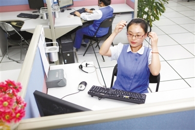 昨日,中國聯(lián)通二區(qū)分公司內(nèi),接線員郭婷玉在為打進(jìn)電話的市民處理完預(yù)約掛號(hào)服務(wù)后摘下耳機(jī)。
