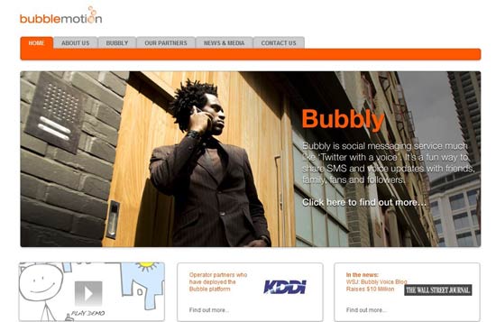 “Bubble Motion”的Bubbly平臺是一個手機端的語音微博服務(wù),允許用戶通過聲音向他們的關(guān)注者和粉絲發(fā)布狀態(tài)信息,模式與Twitter一樣,只是將文字變成了聲音,微博變成了bubbles,用戶將錄制的聲音更新到手機,然后所有粉絲將收到一條短信通知,點擊短信內(nèi)的鏈接就可以收聽。