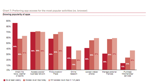因?yàn)楸憬菪院透S富的用戶體驗(yàn),APP在很多方面已經(jīng)并肩或者超過瀏覽器在用戶使用移動互聯(lián)網(wǎng)中的作用;而在未來用戶首選APP的意愿會更加強(qiáng)烈