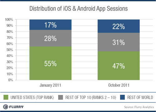 使用iOS和Android設(shè)備和其他新技術(shù)一樣,最早開始于可支配收入較高的北美和西歐地區(qū)。然而,隨著型號較舊的iOS產(chǎn)品價格下降,以及Android設(shè)備的生產(chǎn)商提供了更多大家買得起的低價設(shè)備,包括新興市場在內(nèi)的國際市場的消費(fèi)者越來越多。下圖顯示了移動應(yīng)用下載如何擴(kuò)張到美國之外。