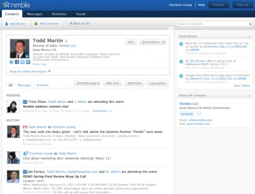 在一切皆可社會(huì)化的今天,客戶關(guān)系管理(CRM)服務(wù)的社交色彩也開(kāi)始變得越來(lái)越濃。該領(lǐng)域內(nèi)的創(chuàng)業(yè)公司Nimble最近升級(jí)了它們的服務(wù),升級(jí)后的Nimble 2.0版更加強(qiáng)調(diào)社交信息的聚合管理,試圖給側(cè)重“信息輸入”的CRM服務(wù)領(lǐng)域帶來(lái)新變化。