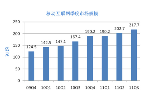 上圖是易觀國際發(fā)布的移動互聯(lián)網(wǎng)的相關(guān)數(shù)據(jù),數(shù)據(jù)截止到2011年第三季度,該圖顯示,2009年全球經(jīng)濟復(fù)蘇之后,移動互聯(lián)網(wǎng)業(yè)務(wù)收入一直保持著良好的增長狀態(tài),最新數(shù)據(jù)表明,2011年移動互聯(lián)網(wǎng)的整體市場規(guī)模已達到851億,遠超過2010年的637億,增長率將近33.6%,在移動互聯(lián)網(wǎng)業(yè)務(wù)子領(lǐng)域中,表現(xiàn)最突出的是移動電子商務(wù),與2009年相比較,移動電子商務(wù)所占比例由3%直線增長到11%。但是在手機閱讀和手機游戲方面則表現(xiàn)平平,有較大的增長空間。預(yù)計2012年3G用戶規(guī)模將增長到6億,將會超過互聯(lián)網(wǎng)用戶數(shù)量,智能機以及移動互聯(lián)網(wǎng)還會保持或者超過2011年的增長速率。