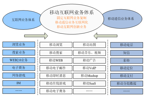 根據(jù)工信部相關(guān)信息,移動互聯(lián)網(wǎng)的業(yè)務(wù)體系主要包括三大類,如下圖所示:一是固定互聯(lián)網(wǎng)的業(yè)務(wù)向移動終端的復(fù)制,從而實現(xiàn)移動互聯(lián)網(wǎng)與固定互聯(lián)網(wǎng)相似的業(yè)務(wù)體驗,這是移動互聯(lián)網(wǎng)業(yè)務(wù)的基礎(chǔ)。二是移動通信業(yè)務(wù)的互聯(lián)網(wǎng)化,如Skype推出的移動VOIP業(yè)務(wù)、中國移動的飛信業(yè)務(wù)等。三是結(jié)合移動通信與互聯(lián)網(wǎng)功能而進行的有別于固定互聯(lián)網(wǎng)的業(yè)務(wù)創(chuàng)新,這是移動互聯(lián)網(wǎng)業(yè)務(wù)發(fā)展方向。對創(chuàng)業(yè)者而言,移動互聯(lián)網(wǎng)的業(yè)務(wù)創(chuàng)新關(guān)鍵是如何將移動通信的網(wǎng)絡(luò)能力與互聯(lián)網(wǎng)的網(wǎng)絡(luò)與應(yīng)用能力進行聚合,從而創(chuàng)新出適合移動終端的互聯(lián)網(wǎng)業(yè)務(wù),如移動Web2.0業(yè)務(wù),如微博、移動位置類互聯(lián)網(wǎng)業(yè)務(wù)等。