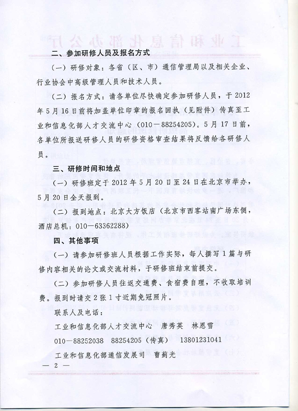 報名方式:請各單位盡快確定參加研修人員,于2012年5月16日前將加蓋單位印章的報名回執(zhí)(附后)傳真至工業(yè)和信息化部人才交流中心(010-88254205)。5月17日前,各單位所報送研修人員的研修資格審查結果將反饋給各研修人員。
