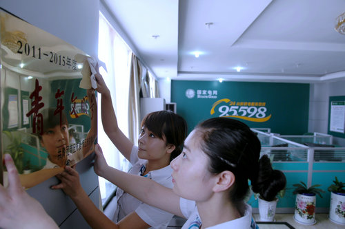 圖為:6 月15日清晨,虞城供電公司95598兩名座席人員在班前對(duì)榮譽(yù)匾牌進(jìn)行細(xì)心的呵護(hù)。