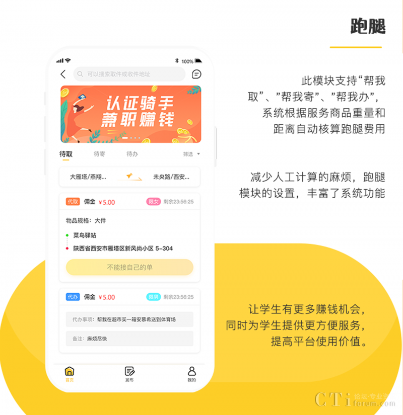 大家都知道,大學(xué)校園人群密集,很多大學(xué)的在校學(xué)生高達(dá)幾萬人,且大學(xué)生消費(fèi)力和消費(fèi)意愿均遠(yuǎn)高于一般人群,同時(shí)大學(xué)生代取快遞、代送外賣、代簽到等服務(wù)的需求很大,大學(xué)的跑腿服務(wù)市場是很大的。校園創(chuàng)業(yè)不僅需求旺盛,同時(shí)商家和用戶都有著高度聚集的特點(diǎn),針對(duì)校園學(xué)生群體,做校園外賣平臺(tái)值得推行。