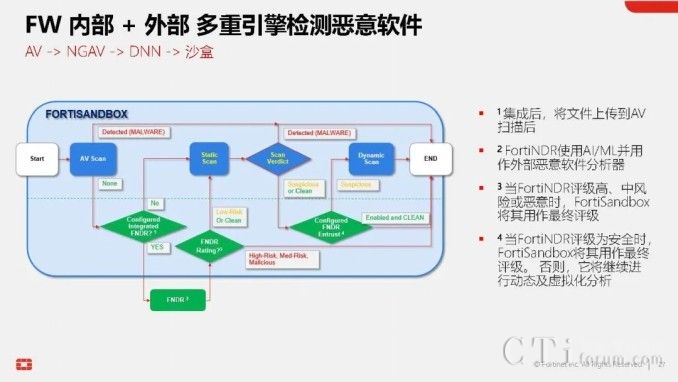 此外,AI技術(shù)還貫穿于Fortinet的多個產(chǎn)品與功能中,形成高效的工作流。以威脅檢測與響應(yīng)為例,當(dāng)FortiGate的雙引擎也無法確定某個文件的合法性時,它可以將該文件提交給FortiNDR進(jìn)行深度分析,利用云端深度神經(jīng)網(wǎng)絡(luò)AI進(jìn)行0 Day攻擊、勒索軟件等深層次分析。若仍無法確定,還可進(jìn)一步提交給FortiSandbox,在虛擬機(jī)環(huán)境中進(jìn)行模擬操作,進(jìn)行更為深入的檢測。在這一系列流程與技術(shù)的支持下,F(xiàn)ortinet的威脅檢測與響應(yīng)能力已達(dá)到業(yè)界頂尖水平,向滿分100分邁進(jìn)。