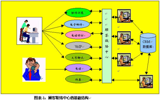 。。呼叫中心通過(guò)多年以來(lái)的發(fā)展,其傳統(tǒng)型的呼叫中心還是主要在以電話為媒介服務(wù)于顧客。這類呼叫中心的基礎(chǔ)結(jié)構(gòu)包括ACD、IVR、CTI等技術(shù)應(yīng)用平臺(tái)和界面,同時(shí)與企業(yè)的后臺(tái)資源相連接,例如大型或相關(guān)數(shù)據(jù)庫(kù)。但是,當(dāng)今的呼叫中心已經(jīng)發(fā)展成為一個(gè)多媒體的服務(wù)或交易渠道,有的還能處理基于互聯(lián)網(wǎng)的垂詢和呼叫,而有的則是一個(gè)虛擬的顧客聯(lián)絡(luò)中心,例如圖表-1中描述的那樣: