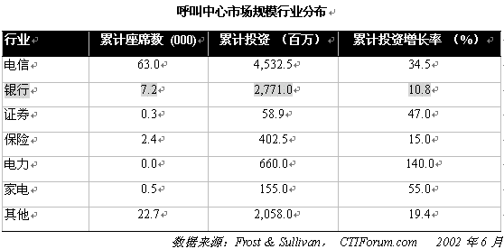 。。中國(guó)呼叫中心市場(chǎng)規(guī)模難于確定。根據(jù)CTIForum 的統(tǒng)計(jì)數(shù)字,截止到2001年,中國(guó)呼叫中心座席總數(shù)達(dá)到96,200個(gè),市場(chǎng)規(guī)模達(dá)到106.38億元,分別較去年同期增長(zhǎng)51.6%,55.2%。2001年,中國(guó)呼叫中心市場(chǎng)規(guī)模在各行業(yè)中的分布如下表所示: