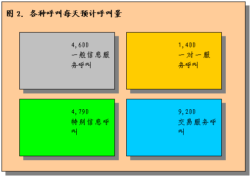 。。為了對此進(jìn)行說明,假設(shè)呼叫中心每天可預(yù)計處理大約20000個呼叫。這包含了上文所述的四種呼叫。將有50%以上呼叫中心接到的呼叫是關(guān)于基本服務(wù)請求或性質(zhì)請求。這種預(yù)計呼叫量不包括預(yù)計呼叫增長量,因為沒有以往信息不能估計出增長情況。而在呼叫中心運行初期通常是沒有這些信息的。應(yīng)在執(zhí)行計劃中進(jìn)行增長假設(shè)分析,保證系統(tǒng)容量在執(zhí)行服務(wù)市場計劃后可以應(yīng)付相應(yīng)的增長水平。