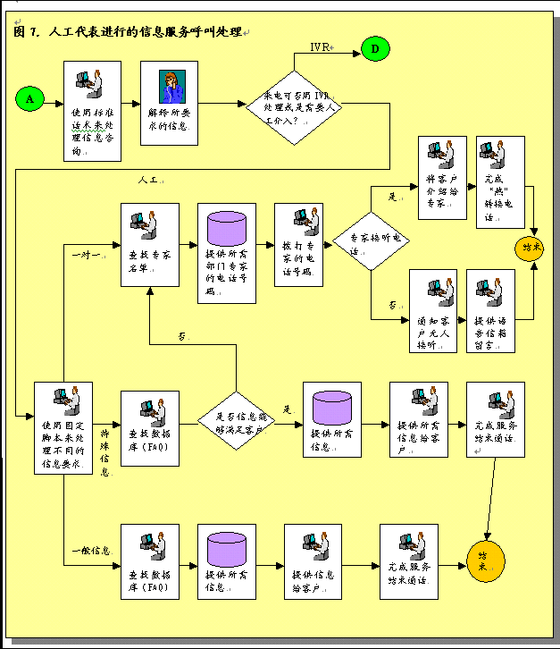 各部門也需要修改步驟處理和完成服務(wù)請求,F(xiàn)在,大多數(shù)公司個(gè)別部門接受和完成服務(wù)請求。許多部門在完成工作之后沒有對結(jié)果進(jìn)行跟蹤回訪。對于一些部門服務(wù)請求只是紙上談兵。為了有效的提供呼叫中心服務(wù)并為服務(wù)請求提供信息,各部門必須采用新的步驟。這些步驟應(yīng)包括從服務(wù)請求系統(tǒng)中重新獲取呼叫請求信息,跟蹤這些請求,工作完成后更新服務(wù)請求系統(tǒng)。對于沒有信息系統(tǒng)和目前使用人工操作的部門,要達(dá)到這一工作要求就需要設(shè)計(jì)和實(shí)施新的程序和系統(tǒng)。
