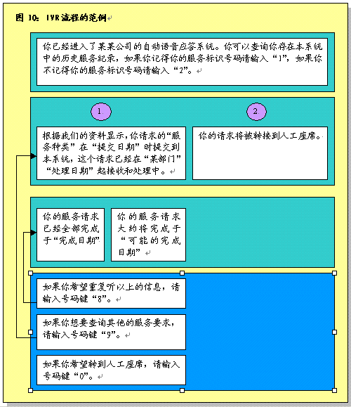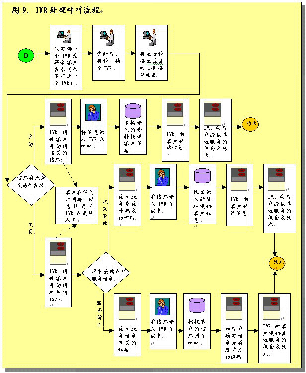 根據(jù)呼叫處理部分所作的說明,在完成初次聯(lián)絡(luò)過程之后,服務(wù)代表將確定呼叫者的需要。之后服務(wù)代表將協(xié)助呼叫者或者使其選擇IVR系統(tǒng),該系統(tǒng)通過自動(dòng)為這些請求錄音提供相關(guān)的信息和服務(wù)。服務(wù)代表將接受培訓(xùn)識(shí)別哪些交易服務(wù)和信息服務(wù)可以通過IVR進(jìn)行,這樣他們可以使呼叫者選擇自我服務(wù)。圖9圖示了用這一辦法處理呼叫的過程。