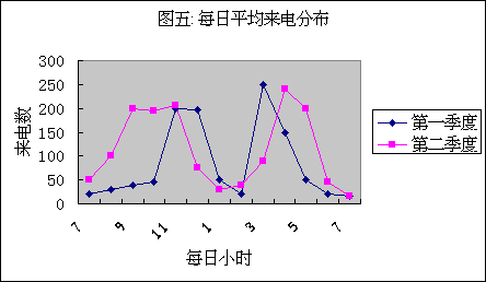 圖五中我們可以看到平均每小時(shí)來電量。比較前一季度與后一季度,我們可以看到每天中來電分布的形態(tài)有很大變化。根據(jù)來電的變化來合理安排座席代表班次,才能保證服務(wù)質(zhì)量不受影響。圖四中客戶放棄率的下降可以部分地說明排班調(diào)整的有效性。