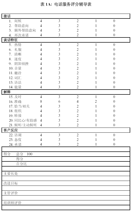 。。無論是客戶服務(wù)還是電話銷售, 輔導(dǎo)表所測定的內(nèi)容一定要和培訓(xùn)內(nèi)容一致起來. 沒有培訓(xùn)過的項目, 不要要求座席代表自行理解.