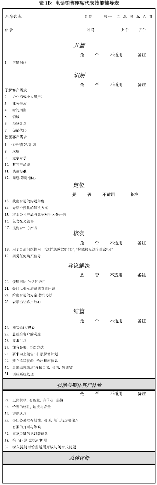 。。以上表格很顯然強調(diào)的是電話銷售的整個完整過程. 通話的態(tài)度與技巧則放在最后通盤考量.