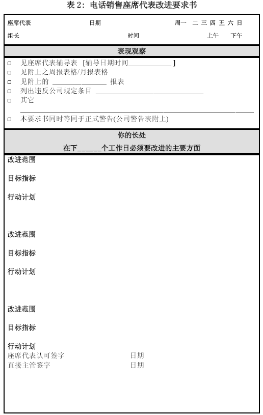 。。這里所列的兩張輔導(dǎo)表應(yīng)該是主管、質(zhì)檢與輔導(dǎo)師最常見的工具。那種無法對通話內(nèi)容進行具體、詳盡分析,或者輔導(dǎo)人自己也定義不清, 不能給出示范與明確改進方向的管理絕對不是專業(yè)的管理。在這類輔導(dǎo)表之外,可以根據(jù)通話的評價和其它一些紀(jì)律觀察,設(shè)計一種“改進要求表”,將根據(jù)表現(xiàn)觀察后制定的改進要求詳細(xì)列出。如果公司有書面警告一類的程序要求,也可揉合進改進要求書。