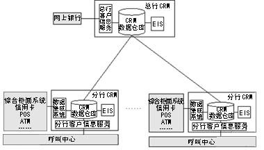 由于銀行在各地建有大量的分支機構,銀行CRM系統(tǒng)一般都采用分布式數(shù)據倉庫環(huán)境,即所有分行均擁有自己的CRM系統(tǒng),并與本地綜合業(yè)務系統(tǒng)及呼叫中心連接。在總行建有中心CRM數(shù)據倉庫,提供面向全行的分析決策功能,并為網上銀行業(yè)務提供數(shù)據查詢支持。