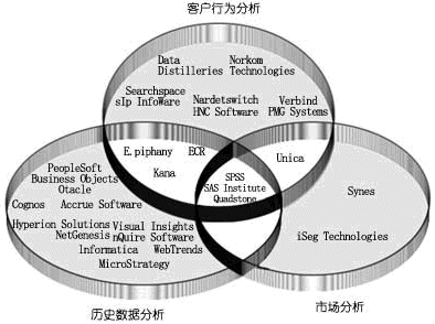 這一市場的供應商目前主要分為兩大陣營:一類著眼于客戶行為傾向分析;另一類著眼于對客戶價值進行評估。前者主要注重了解客戶的喜好,而后者則著重關(guān)注客戶對企業(yè)的潛在收益。