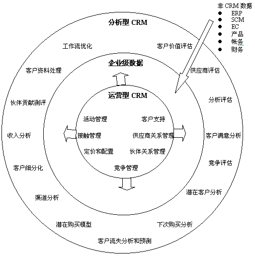 能提供上述問(wèn)題和其他企業(yè)問(wèn)題的客戶(hù)信息,就能夠?qū)蛻?hù)服務(wù)、銷(xiāo)售技巧和隨后的促銷(xiāo)戰(zhàn)略作出關(guān)鍵決策。通過(guò)對(duì)“運(yùn)營(yíng)型”CRM數(shù)據(jù)與來(lái)自于全公司的信息進(jìn)行集成,公司便能夠開(kāi)始執(zhí)行分析型CRM;并且執(zhí)行后,可以作出真正的“以客戶(hù)為中心”的企業(yè)決策。