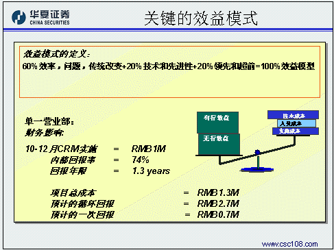 華夏證券經(jīng)紀業(yè)務總部的姚磊作為唯一的成功應用案例代表,主要是和與會的金融機構分享在客戶關系管理規(guī)劃方面的一些成功經(jīng)驗。華夏證券認為,對于證券公司的經(jīng)紀業(yè)務來講,客戶關系管理的主要目標應該是把客戶關系管理系統(tǒng)的核心功能融入開戶、交易、服務、咨詢等四個與客戶互動的過程之中,比如:客戶資料規(guī)戶整合形成統(tǒng)一的客戶號,管理客戶交易偏好和產(chǎn)品偏好上的變化,配合多種渠道建立一對一銷售流程,客戶終身價值管理。在風險控制方面,華夏證券同樣貢獻了寶貴的經(jīng)驗,在這方面他們認為最重要的方面是要做好高層領導的灌輸和培訓工作,讓企業(yè)的高層領導對于客戶關系管理有一個正確的理解,從而對于項目的投資有一個合理的預期和實證,通俗一點說,就是首先為整個項目找一個合適的發(fā)起人。第二點要注意,要有專業(yè)的項目管理隊伍,這其實就是集成商選擇方面的風險。除此之外,還要對項目要有一個明確的定義,關注每一步提交的結果,在項目過程中就隨時發(fā)現(xiàn)問題、解決問題。