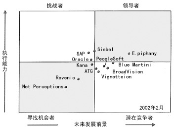 Siebel 和Oracle因?yàn)樵谄銫RM中整合了E-Marketing以及公司強(qiáng)大的資金實(shí)力,因此在挑戰(zhàn)者中最為引人注目。預(yù)計(jì)Siebel 將在6到12個(gè)月內(nèi)進(jìn)入E-Marketing市場(chǎng)的領(lǐng)導(dǎo)者行列。SAP首次出現(xiàn)在這一群體之中,但是它的強(qiáng)項(xiàng)在于其產(chǎn)品易于與已安裝的其它軟件相集成,而不是其E-Marketing的功能,這一點(diǎn)限制了那些沒有購(gòu)買過SAP產(chǎn)品的企業(yè)接受其產(chǎn)品。