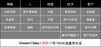 GreaterChinaCRM提出了一組量度標準(五個范圍共17項),不僅覆蓋了軟件/技術方面的回報,也綜合包括了策略,人,流程,技術和客戶。這些量度標準告訴我們應當如何看待和評估CRM的實施。讓我們來看一下:
