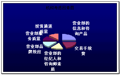 。。具筆者調(diào)查,現(xiàn)在對(duì)營(yíng)業(yè)部盈利最大的是機(jī)構(gòu)客戶(hù)或者大額個(gè)人投資者,而隨著股市行情的低彌,他們?cè)谶x取營(yíng)業(yè)部的考慮因素主要關(guān)鍵點(diǎn)及其所占比例如下圖: