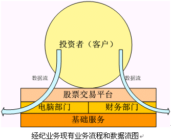 。。從上圖可以看出,現(xiàn)在的證券公司的經(jīng)紀業(yè)務為各個股民或者說投資者所提供的服務就是交易平臺的服務,也就是交易通道服務。營業(yè)部的其他服務都是為這個交易通道服務,這些服務品種都是非常基礎的。而營業(yè)部的數(shù)據(jù)流,也就是各個客戶的基本信息和交易信息,通過電腦部和財務部門就走到了終結(jié),沒有被更好的利用。