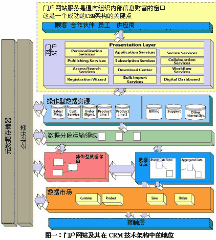 圖一向我們展示了一種CRM技術架構,它以Web門戶網站作為客戶、合作伙伴、員工和供應商之間的通路,并以此作為它的主要特征。