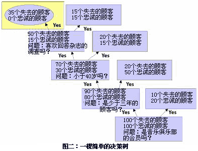 你可以從它的名字中猜到,決策數是一種樹型分析模型。樹枝代表了用來定義或者細分客戶的不同問題。比如,假設一家音樂俱樂部想要分析為什么一些會員不會再次申請它的會員資格(該俱樂部會員采取月申請制)。為了形成決策樹,公司召集了一批由100個忠誠顧客、100個非忠誠或者已經公司已經失去的顧客組成的測試小組。然后,公司開始提出一系列問題,要求顧客形容一下忠誠的顧客和非忠誠的顧客是什么樣子的。整個決策樹就如圖二所示。