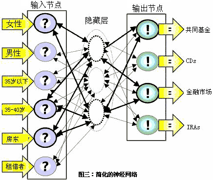 假設該集團的數據組包括了100000個現有和潛在的顧客。數據組中所有成員至少滿足一個列示于每個輸出節(jié)點邊上的特征條件,比如說,他們的年齡小于35歲或者是在35-40之間,男性或者女性,房東或者租借人。BPN從所有的輸入節(jié)點中獲得數據,并且以此編譯一個預測型模型。這個簡單的模型告訴使用者,年齡在35-40歲之間的男性房東最有可能購買共同基金和金融市場產品。這是BNP能預測的信息。